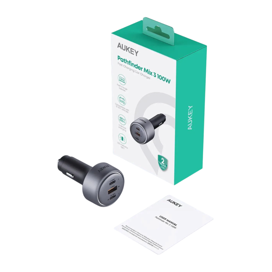 AUKEY Pathfinder Mix 3 оснащено сразу тремя портами: одним USB-A и двумя Type-C. Общая выходная мощность достигает 100 Вт, что позволяет одновременно подключать разные устройства — от смартфонов и планшетов до ноутбуков с поддержкой зарядки по USB. А небольшое светодиодное кольцо с мягким свечением деликатно подсвечивает зону портов и информирует о статусе процесса зарядки даже в условиях слабого освещения салона автомобиля.