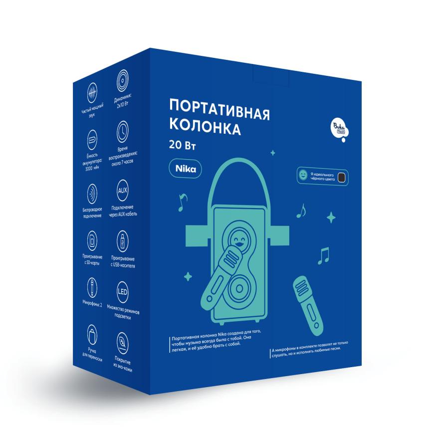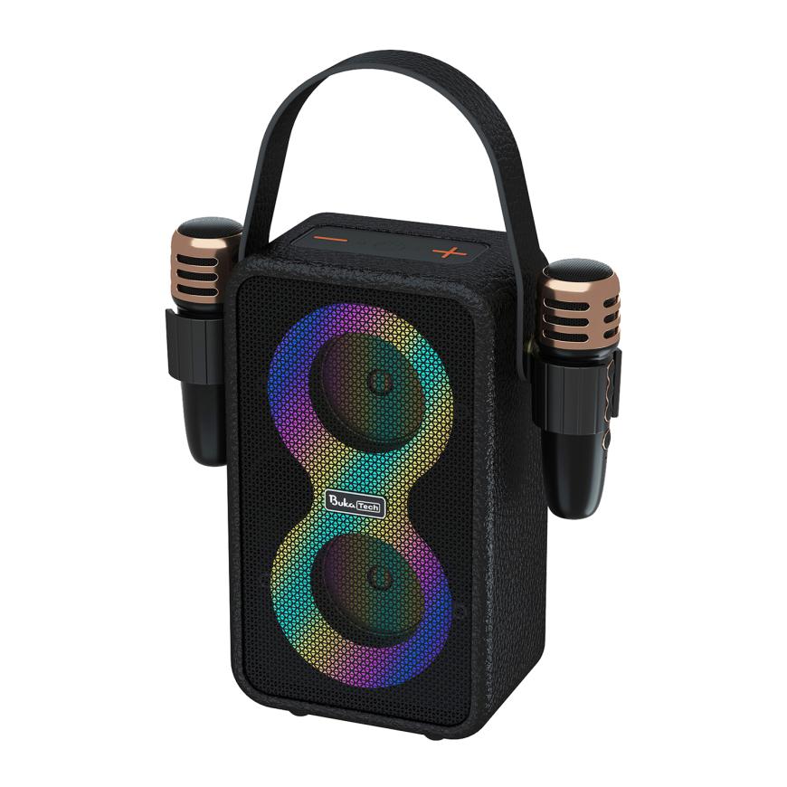 Портативная колонка BukaTech Nika создана для тех, кто любит караоке. В комплекте с устройством идут два беспроводных микрофона, так что вам не придётся докупать что-либо ещё для свой вечеринки. Вы сможете петь дуэтом с друзьями, устраивать вокальные баттлы или использовать колонку для проведения каких-то небольших мероприятий, например утренников в детском саду. Для создания праздничной атмосферы колонка имеет RGB-подсветку.