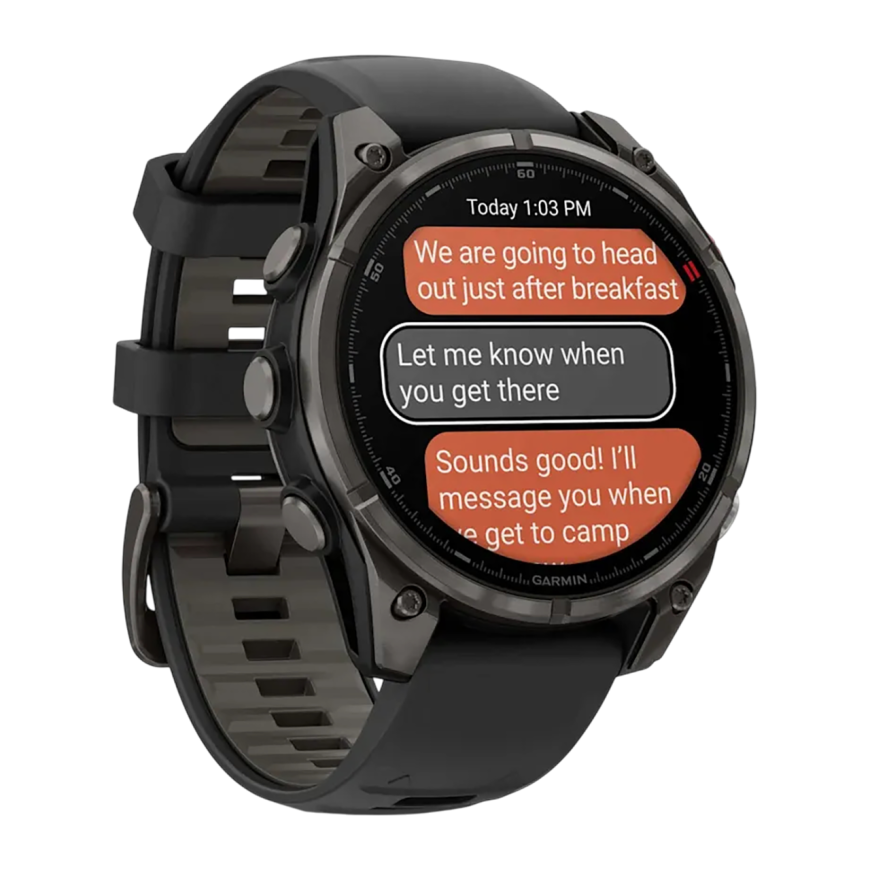 Cпортивные часы Garmin fenix 8 Pro, 47 мм, AMOLED, титан с DLC, сапфир, силиконовый ремешок цвета «чёрный/серый» Тёмно-серый безель из титана с DLC-покрытием, AMOLED-дисплей. Ремешок с классической застёжкой — на запястье обхватом 125–208 мм
