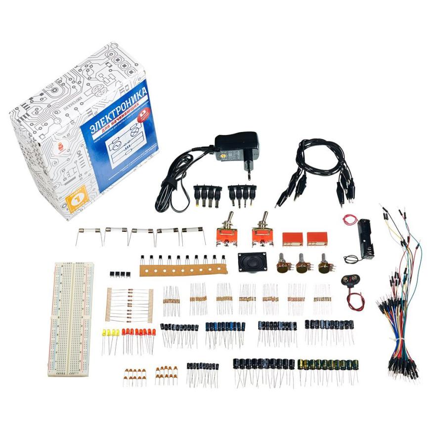 Конструктор включает в себя широкий ассортимент компонентов, необходимых для создания различных электронных схем и устройств. В комплект входят резисторы, конденсаторы, транзисторы, светодиоды, кнопки, провода и макетная плата. Также в наборе присутствуют подробные учебные материалы, которые шаг за шагом будут погружать вас в мир электроники.