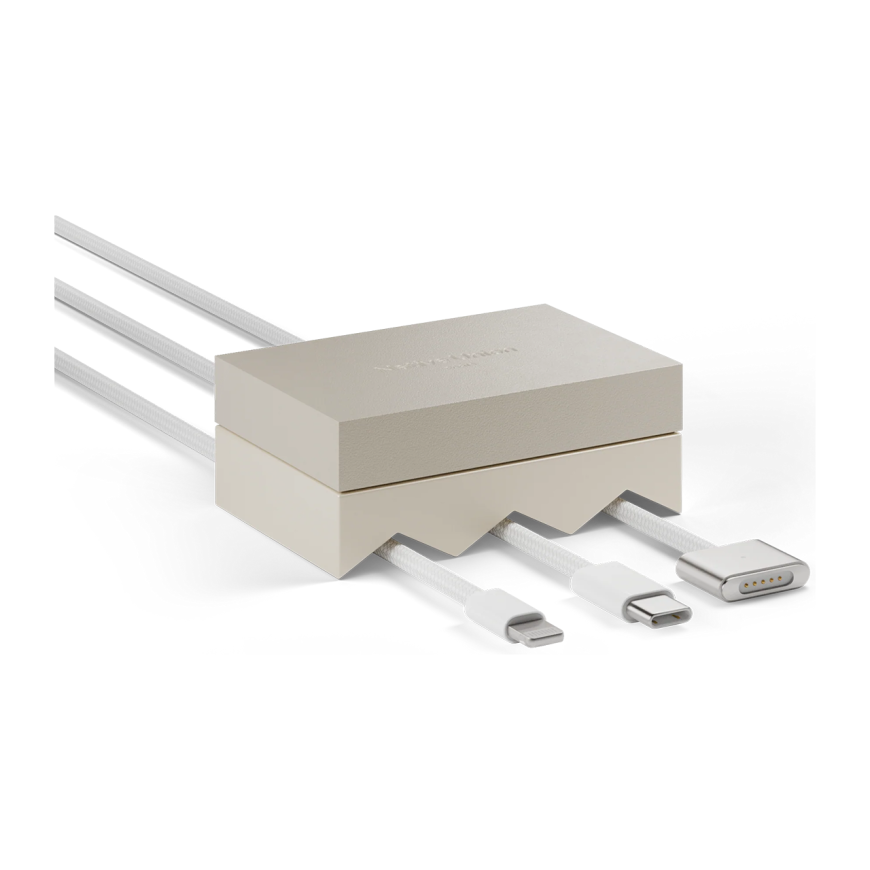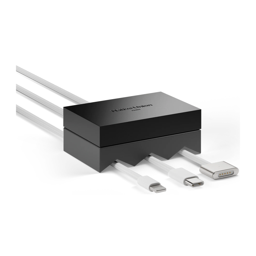 Native Union Weighter рассчитан сразу под три кабеля, так что можно доверить ему, например, зарядки от ноутбука, смартфона и планшета. Важно, что арочные вырезы созданы так, чтобы обеспечить совместимость с большинством проводов, а также их свободное скольжение и лёгкую регулировку длины. А это помогает не только избежать сползания, но и организовать зону подключения – с таким помощником на столе кабели не переплетаются и остаются доступными по отдельности, когда это нужно.