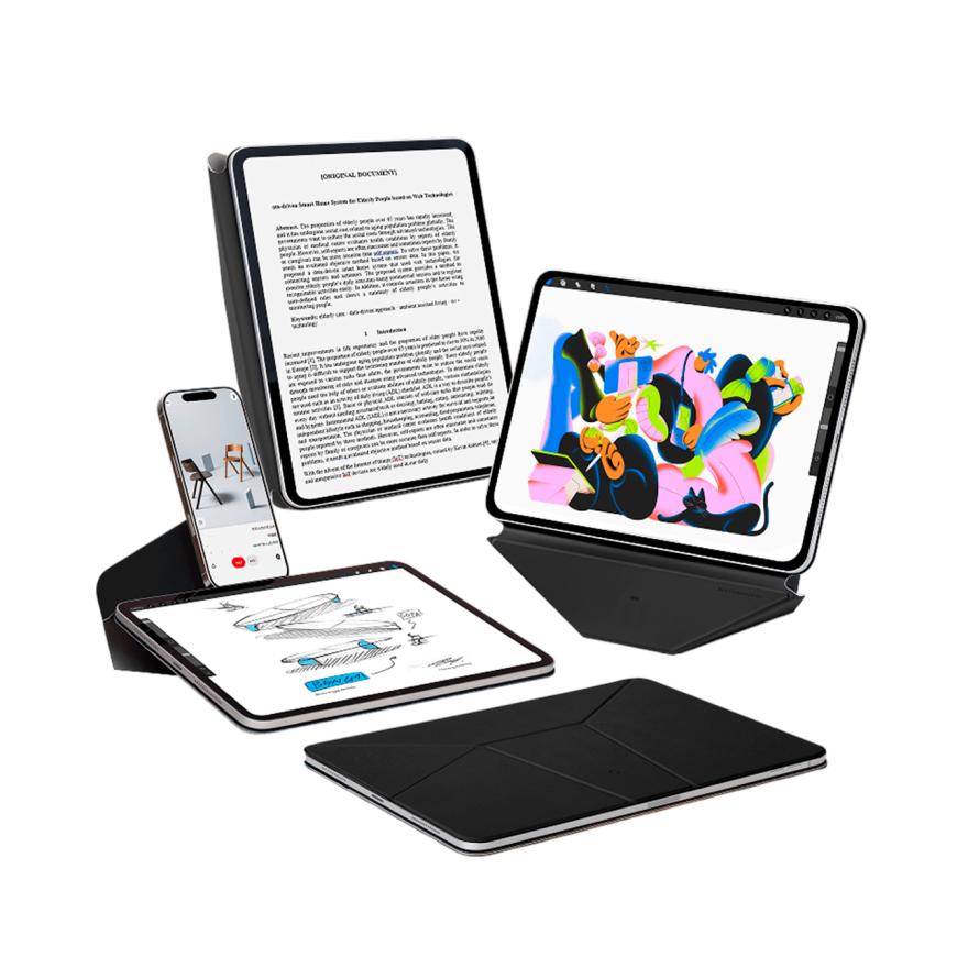 Чехол-подставка для двух устройств MOFT Dynamic Folio – не просто очередная обложка для iPad, а довольно оригинальный аксессуар, ведь он может выступать в качестве подставки одновременно для двух устройств: планшета и смартфона. Представьте: вы можете рисовать или редактировать видео на планшете, а прямо над ним, расположить свой iPhone для видеозвонков или просмотра вертикального контента в социальных сетях. А ещё обложка позволят расположить iPad под комфортным углом в вертикальном режиме. Приятная на ощупь веган-кожа Обложка-подставка MOFT Dynamic Folio выступает и в качестве защитного аксессуара. Она убережёт спинку и дисплей iPad от появления царапин и потёртостей. При этом аксессуар изготовлен из приятной на ощупь фирменной веган-кожи MOVAS. Этот материал отличается своей износостойкостью. Его сложно поцарапать, а ещё он не выцветает. Сам аксессуар достаточно тонкий и практически не добавляет лишнего объёма вашему планшету. Всё для вашего комфорта Уникальная конструкция подставки-оригами позволяет ставить планшет как угодно. Смотрите новости, читайте, печатайте и рисуйте. Тут меняется и положение и даже высота! А ещё можно просто поставить iPad почти вертикально на возвышении для комфортного просмотра видео или использования в качестве умной фоторамки; И даже айфон здесь можно ставить в портретном и альбомном положениях. Профессионалы точно оценят В зависимости от выбранного положения, доступно более 20 вариантов угла наклона, а ещё конструкция сгибов откидной части позволяет с комфортом рисовать, поставив планшет себе на колени, она буквально создано такой ради этой возможности! Ну а чтобы не потерять свой стилус, можно приобрести специальный отдельный держатель, который дополнительно фиксирует Apple Pencil.