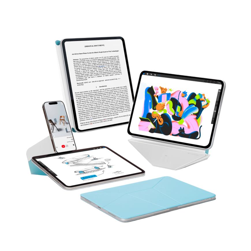 MOFT Dynamic Folio – не просто очередная обложка для iPad, а довольно оригинальный аксессуар, ведь он может выступать в качестве подставки одновременно для двух устройств: планшета и смартфона. Представьте: вы можете рисовать или редактировать видео на планшете, а прямо над ним, расположить свой iPhone для видеозвонков или просмотра вертикального контента в социальных сетях. А ещё обложка позволят расположить iPad под комфортным углом в вертикальном режиме.