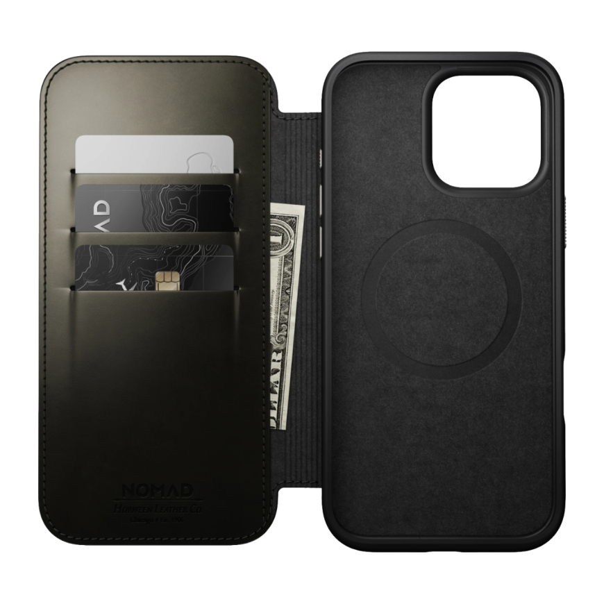 Чехол Nomad Modern Leather Folio Limited Edition имеет внутренние кармашки, в которые поместятся не только банковские карты и визитки, но и, например, водительское удостоверение. А значит вам не придётся постоянно носить с собой портмоне. Конструкция чехла-книжки также обеспечивает дополнительную защиту экрана iPhone, а значит можно обойтись без дополнительного защитного стекла.