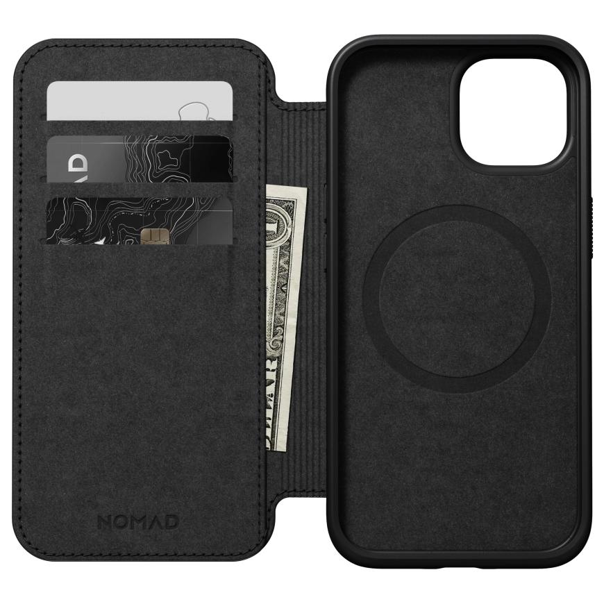 Удобный флип-чехол от NOMAD, сделанный из премиальной натуральной кожи от Horween. Он обеспечивает высокий уровень защиты смартфона, выдерживая падения с высоты до 2,5 метров, а откидная часть не только защищает дисплей, но и примечательна тремя отделениями для банковских карт.