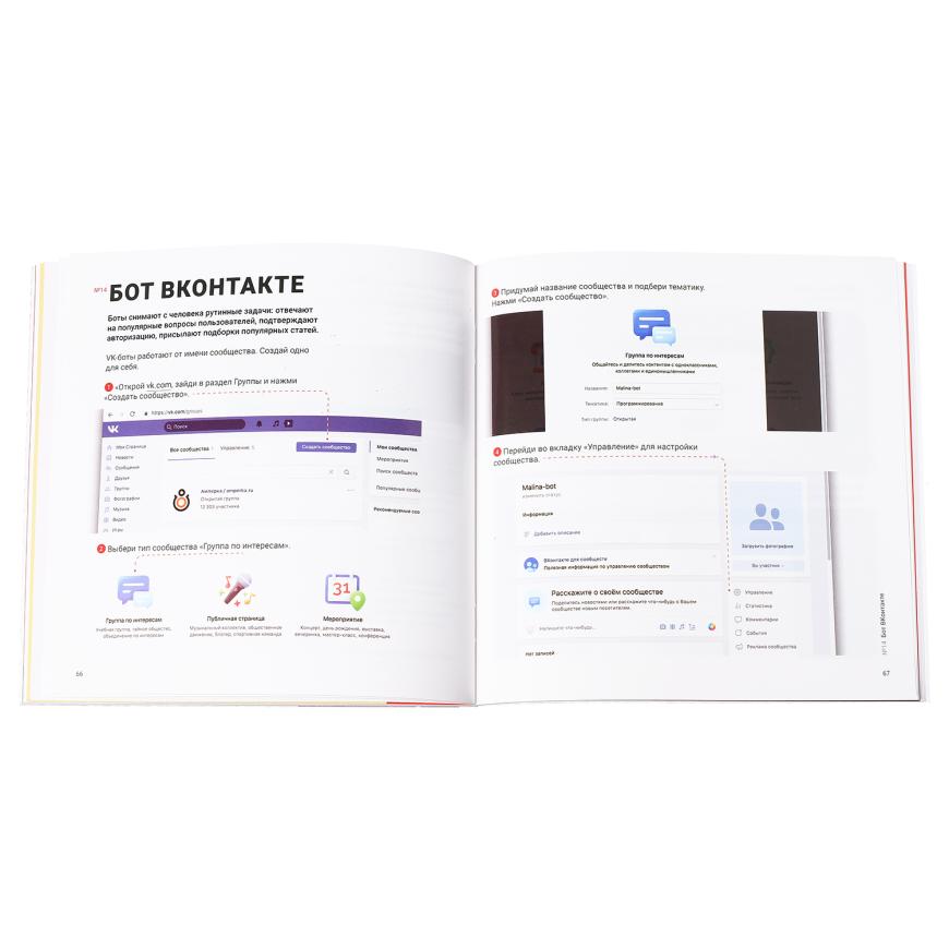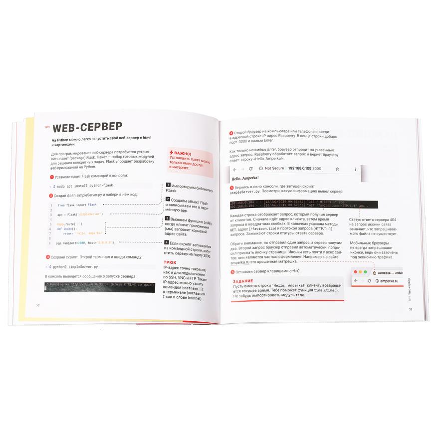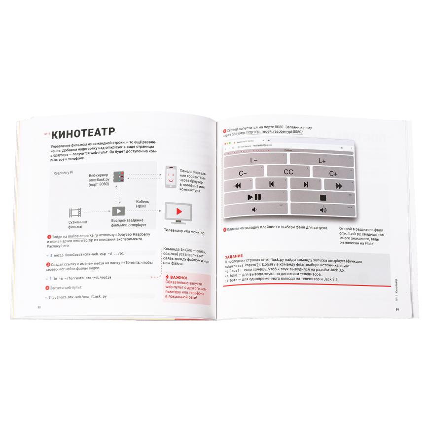В наборе вы найдёте красочную книгу с подробными инструкциями. После вводного курса по операционной системе Linux вы перейдёте к программированию на языке Python. Вы научитесь web-программированию, а после соберёте медиацентр для домашнего кинотеатра. На основе «Малина» v4 можно создать сервер «умного дома». При желании к микрокомпьютеру можно подключить камеру и разместить на его корпусе двигатель и колёса (в комплект не входят). В итоге вы сможете создать настоящего робота.