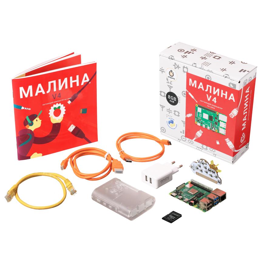 В набор входит микрокомпьютер Raspberry Pi 4 Model B. Его размер чуть больше банковской карты. На этой крошечной плате уместили центральный процессор, оперативную память, порты HDMI, классические порты USB, разъём Ethernet, а также модули Wi-Fi и Bluetooth. Работает микрокомпьютер на операционной системе Linux. В комплект также входят все необходимые кабели и сетевой адаптер. Данная версия имеет увеличенный объём ОЗУ, составляющий 8 ГБ.