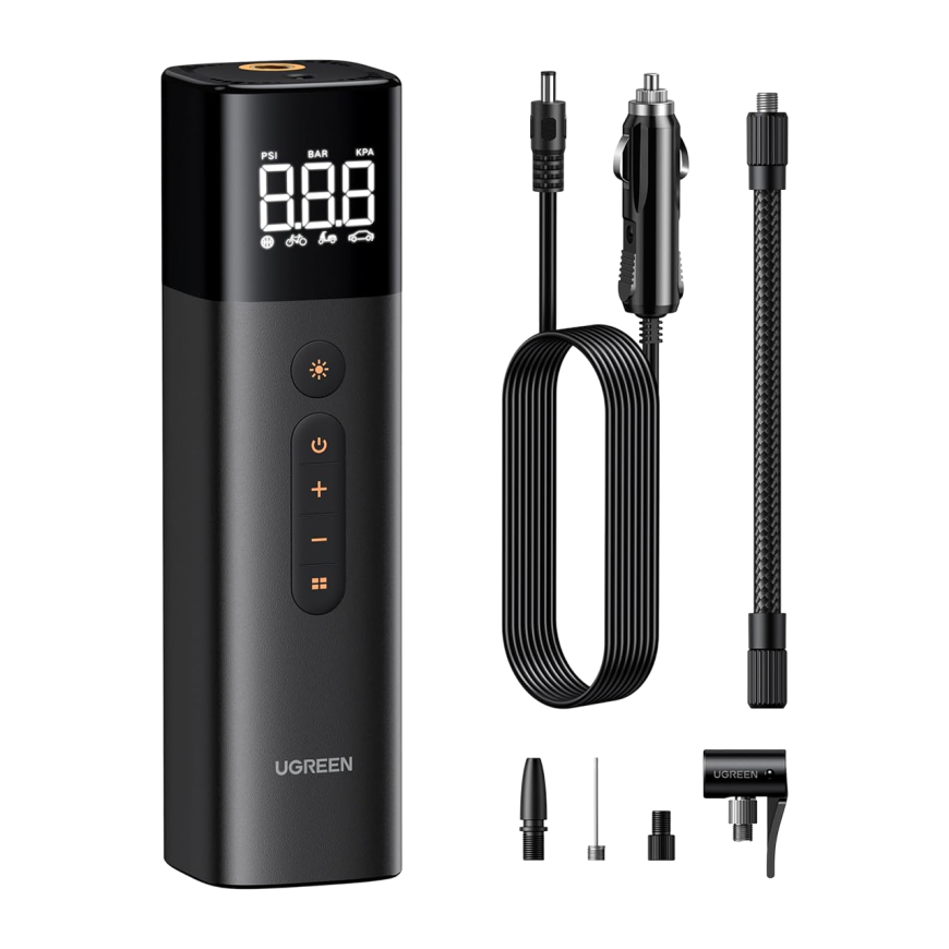 Полный комплект лёгкого компрессора Ugreen ET501 (с 20-сантиметровым шлангом, кабелем, чехлом и переходниками) едва ли дотягивает до полукилограмма, а малый размер позволяет разместить его в любой нише автомобиля или кофрах мотоцикла. Питается он от 12V прикуривателя с помощью комплектного съемного 3–метрового кабеля, и управляется несколькими клавишами, расположенными вместе с крупным дисплеем на корпусе. Последний при включении показывает активный выбранный режим работы (мяч, велосипед, мотоцикл, автомобиль или пользовательский) и текущее давление накачиваемого объекта в выбранных единицах измерения (барах, килоПаскалях или фунтах на квадратный дюйм). Клавиши + и – позволяют программировать каждый из режимов, чтобы по достижении заданного давления компрессор отключался автоматически (настройки запоминаются в памяти).