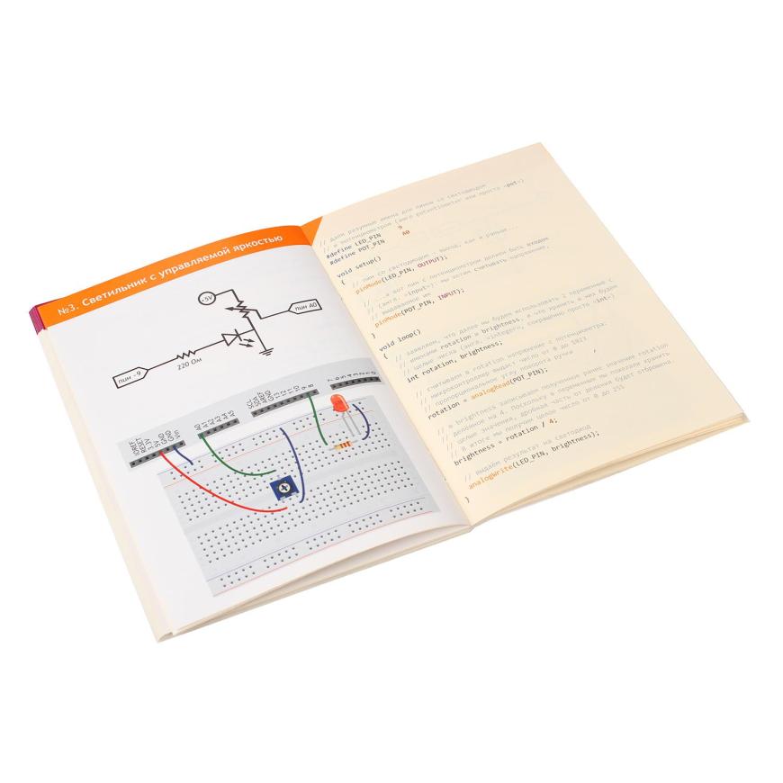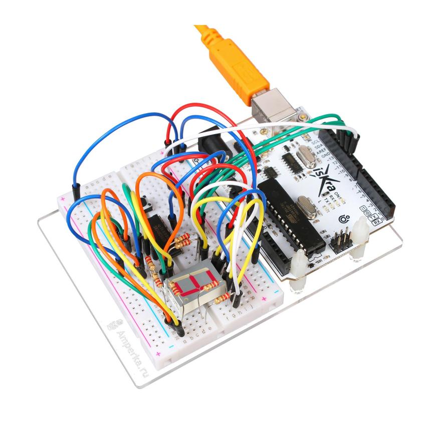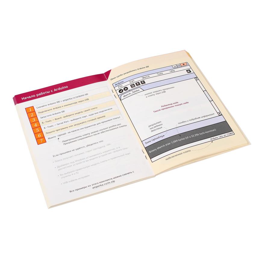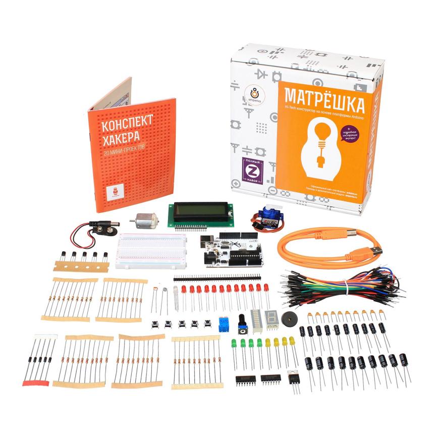 В набор «Матрёшка Z» входит платформа Arduino Uno, макетная плата, набор радиодеталей и все необходимые провода. Кроме того, в коробке вы найдёте подробную инструкцию, которая поможет вам собрать своё первое электронное устройство и начать программировать на языке C++.