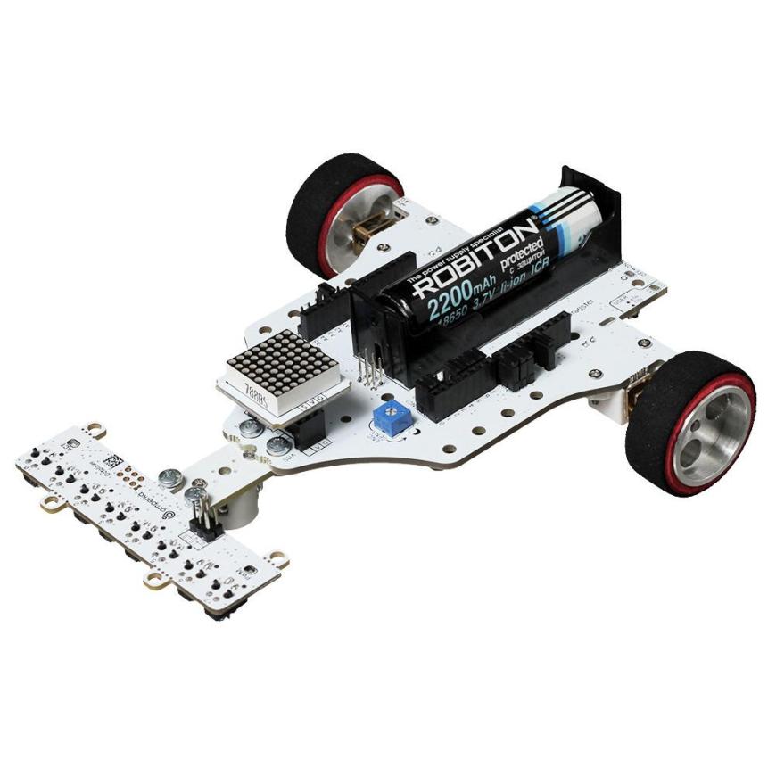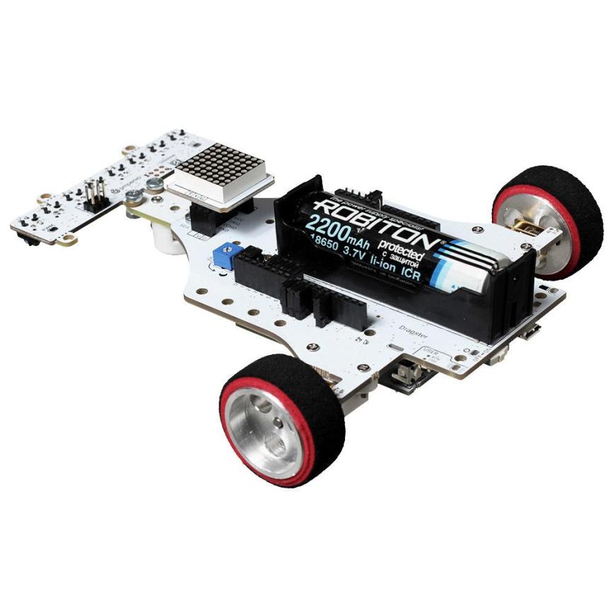 В комплекте с роботом «Драгстер» вы найдёте всё необходимое. В набор входят: полностью собранный болид на плате Iskra Neo (аналог Arduino Leonardo, но полностью производимый в России и не уступающий по качеству), аккумулятор 18650, комплект наклеек, кабель питания для зарядки (USB А — Micro USB), ключ-шестигранник для замены двигателей и колёс и подробную книгу-инструкцию. Так что можно сразу приступать к экспериментам!