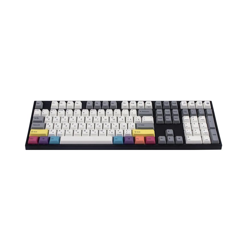 Varmilo Vintage Days CMYK V2 имеет 108 клавиш, изготовленных из качественного РВТ пластика. Кейкапы имеют приятную, чуть шероховатую поверхность, которая гарантирует точное позиционирование при печати. Символы русского и английского алфавита нанесены на поверхности по технологии сублимированной печати, так что не сотрутся даже при интенсивном использовании. Для этой модели были выбраны два основных цвета - белый и серый. А главной фишкой Vintage Days CMYK стал набор цветных кейкапов для главных функциональных клавиш, таких как Ctrl, Alt, Shift, Win и Fn. Причём поставить их можно с учётом своих предпочтений. А если вы захотите добавить строгости - тоже не вопрос. В комплекте найдётся сменный набор серого цвета.