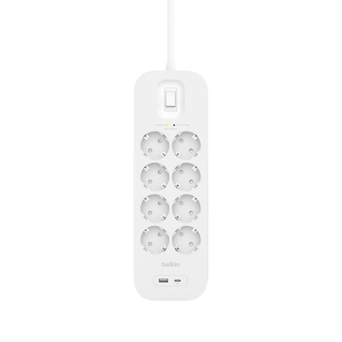 Нужно подключить много устройств, поставить на зарядку все девайсы или быстро организовать рабочее место? Не вопрос! Ведь тут найдётся сразу 8 евро-розеток и 2 USB-разъема (по одном А и С). Кстати, Type-C здесь поддерживает технологию Power Delivery, так что гаджеты могут восполнить запас энергии до 70% быстрее, чем при использовании традиционных 5-ваттных блоков. Но самое главное, что Belkin Connect можно доверять даже дорогостоящие вещи, ведь здесь реализована целая система защиты от скачков напряжения, перегрева, перенапряжения и прочих сетевых неполадок. А то, что она работает, подскажет небольшой световой индикатор.