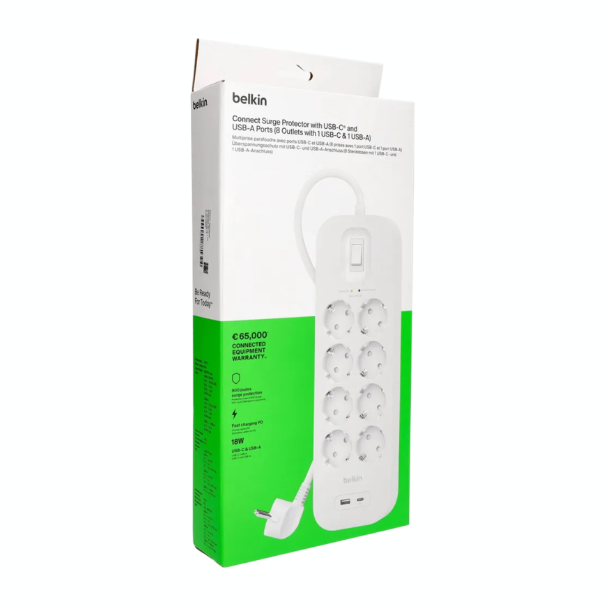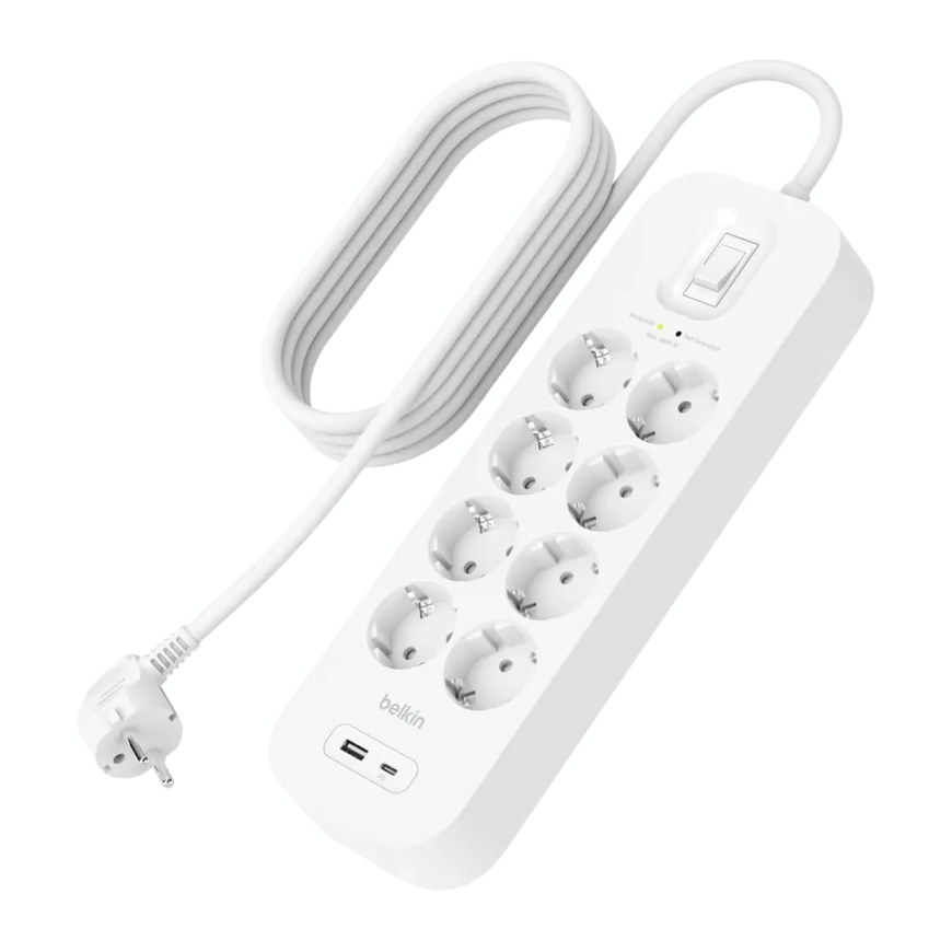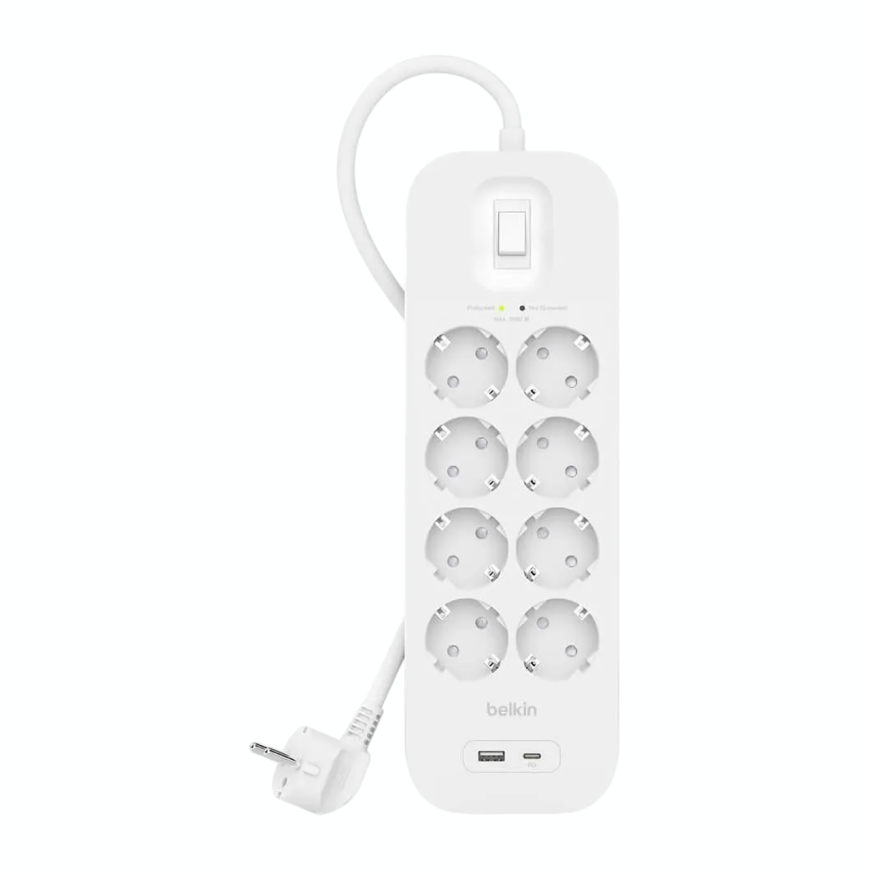Когда дома или в офисе розеток вечно не хватает, Belkin Connect приходит на помощь как герой блокбастера. Восемь полноценных розеток справляются с техникой любой мощности – от принтера до обогревателя. А ещё здесь есть два USB-порта: один USB-C и один USB-A. Можно заряжать телефон, наушники или пауэрбанк без переходников и лишнего кабельного зоопарка. Всё под рукой и на своём месте – идеальный помощник для тех, кто ценит комфорт и функциональность.