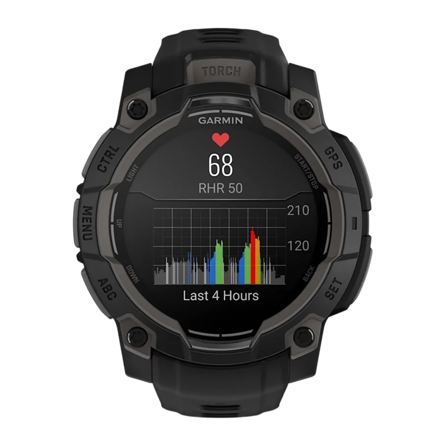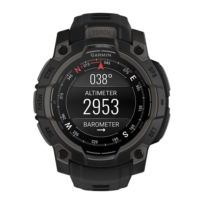 Спортивные часы Garmin Instinct 3, 45 мм, AMOLED, чёрный силиконовый ремешок Чёрный безель, AMOLED-дисплей. Ремешок с классической застёжкой — на запястье обхватом 137–204 мм