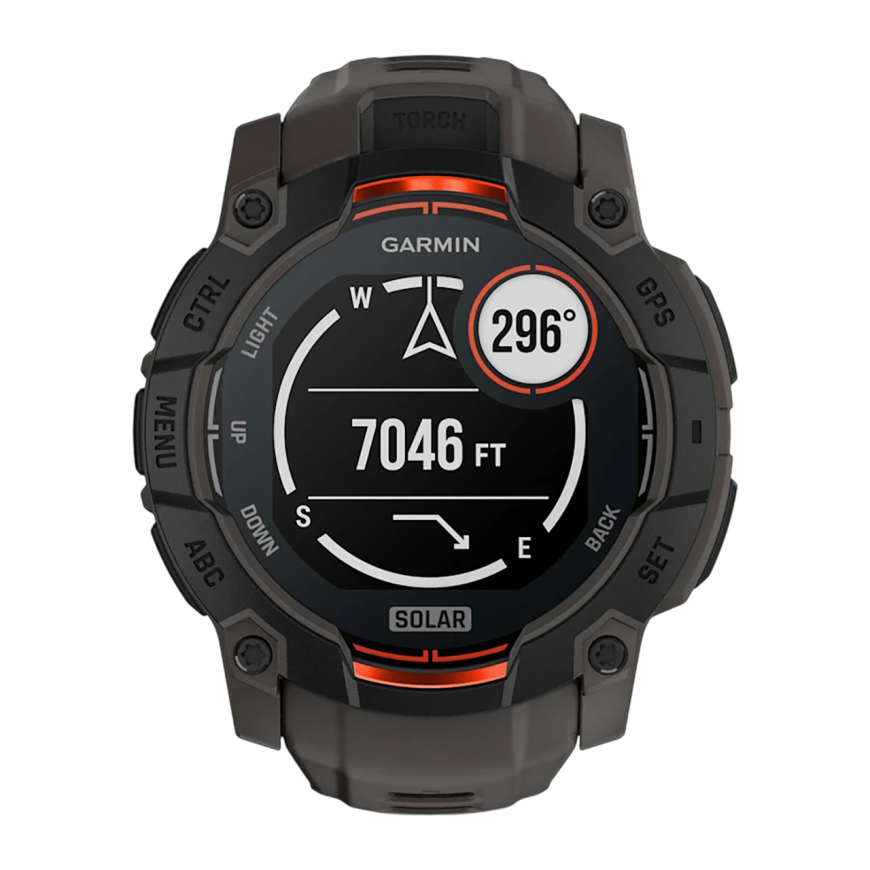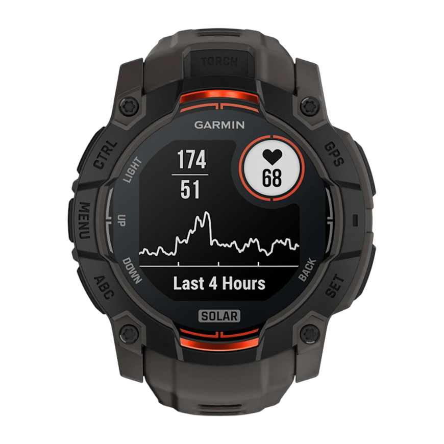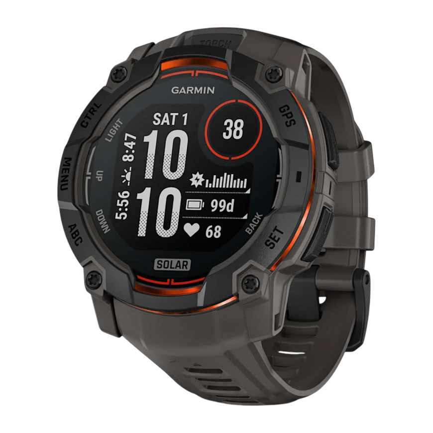 Спортивные часы Garmin Instinct 3, 50 мм, Solar, силиконовый ремешок угольного цвета Чёрный безель, дисплей Solar со стеклом Power Glass. Ремешок с классической застёжкой — на запястье обхватом 141–213 мм