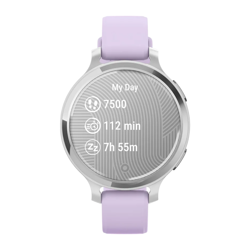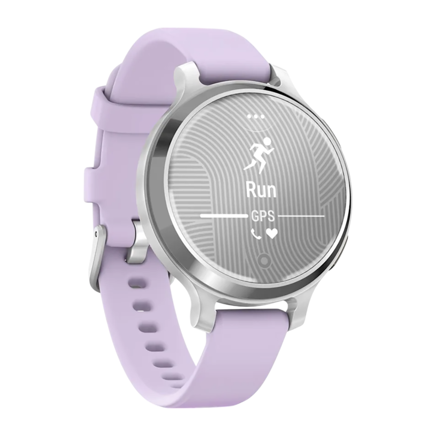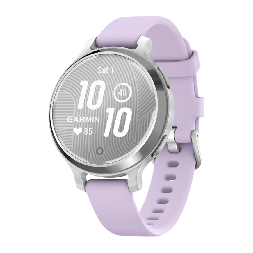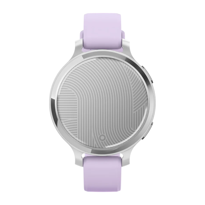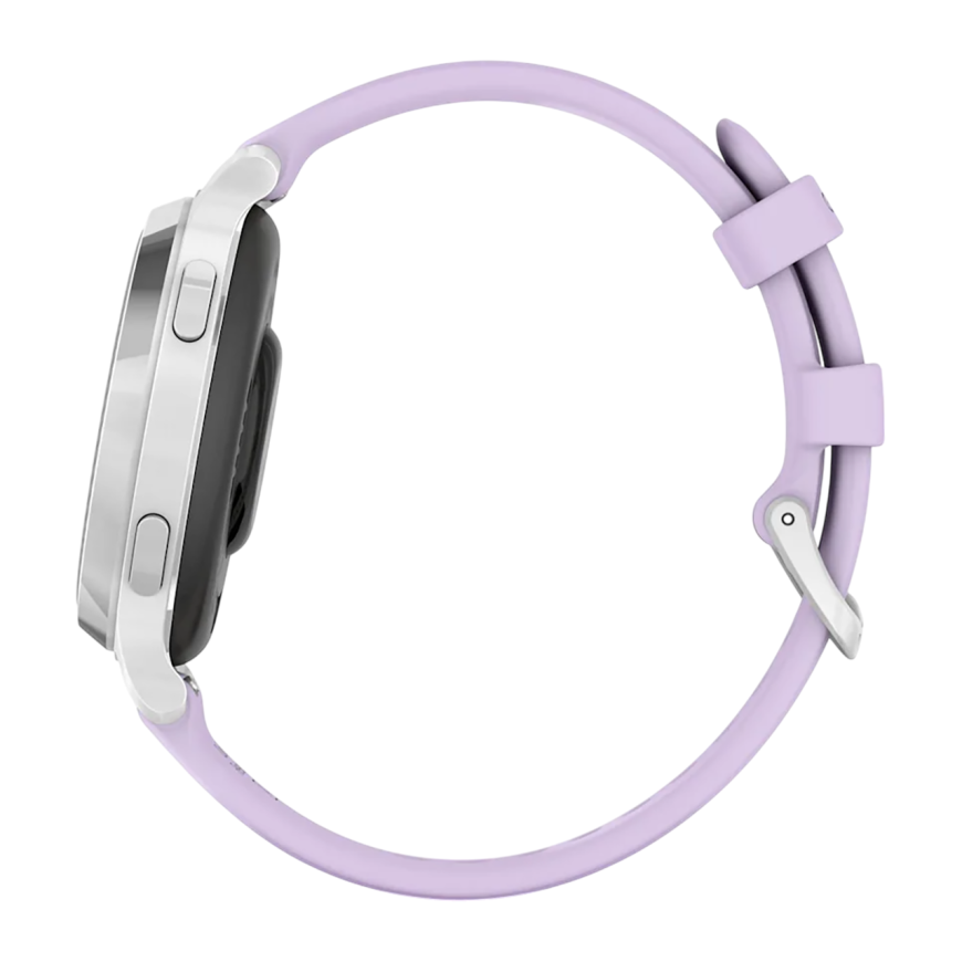 Спортивные часы Garmin Lily 2 Active, силиконовый ремешок цвета «фиолетовый жасмин» Серебристый безель из алюминия, стекло Gorilla Glass. Ремешок с классической застёжкой — на запястье обхватом 110–175 мм