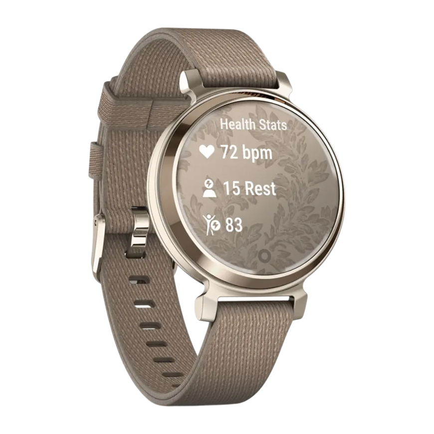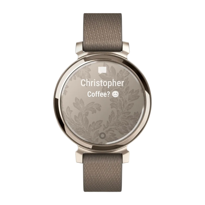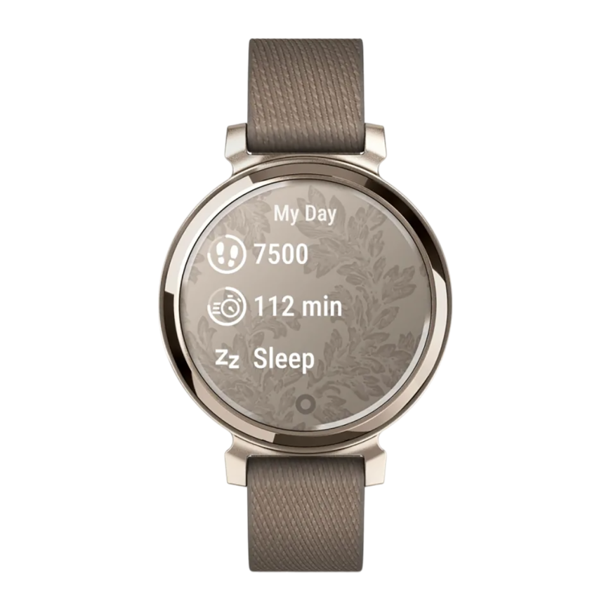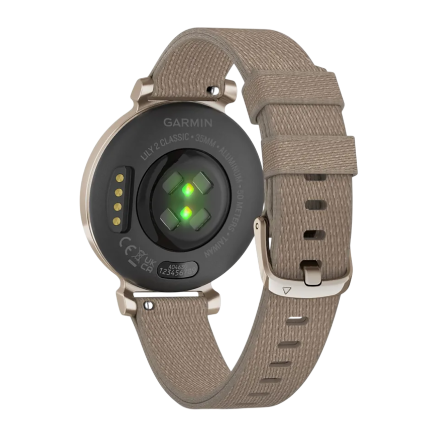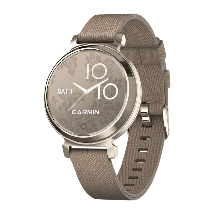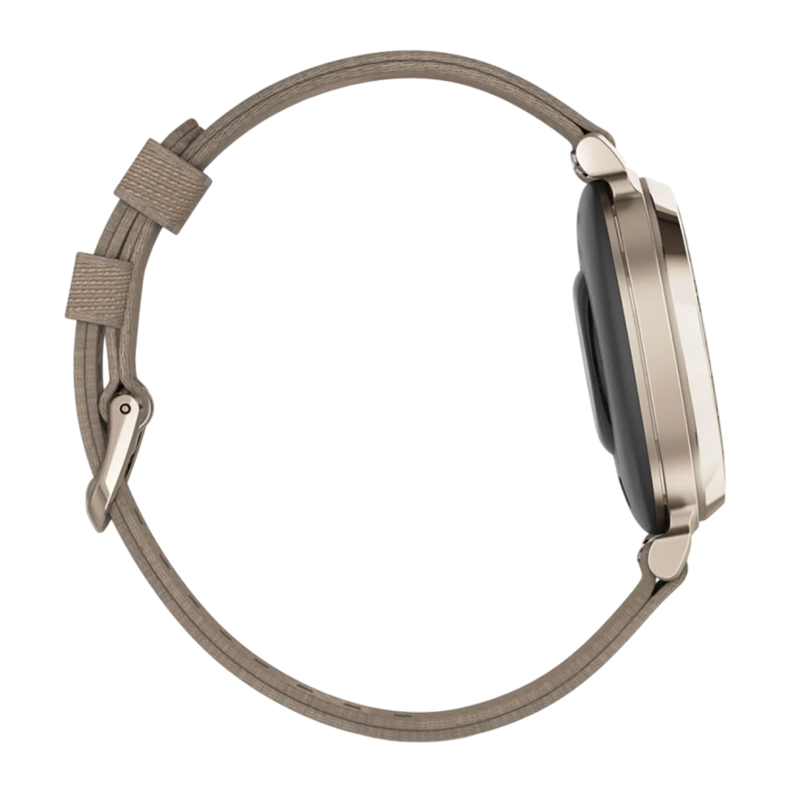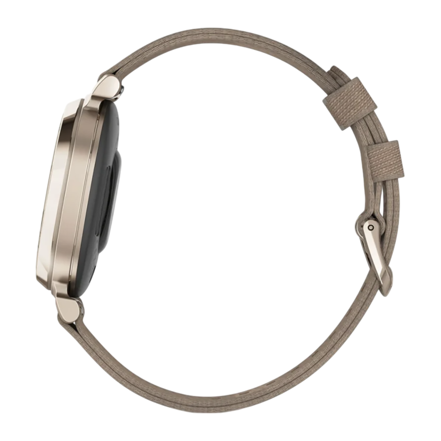 Спортивные часы Garmin Lily 2 Classic, нейлоновый ремешок кофейного цвета Кремово-золотистый безель из алюминия, стекло Gorilla Glass. Ремешок с классической застёжкой — на запястье обхватом 110–175 мм