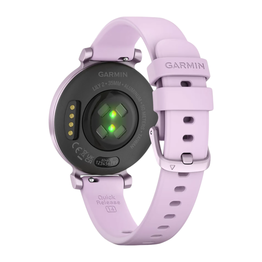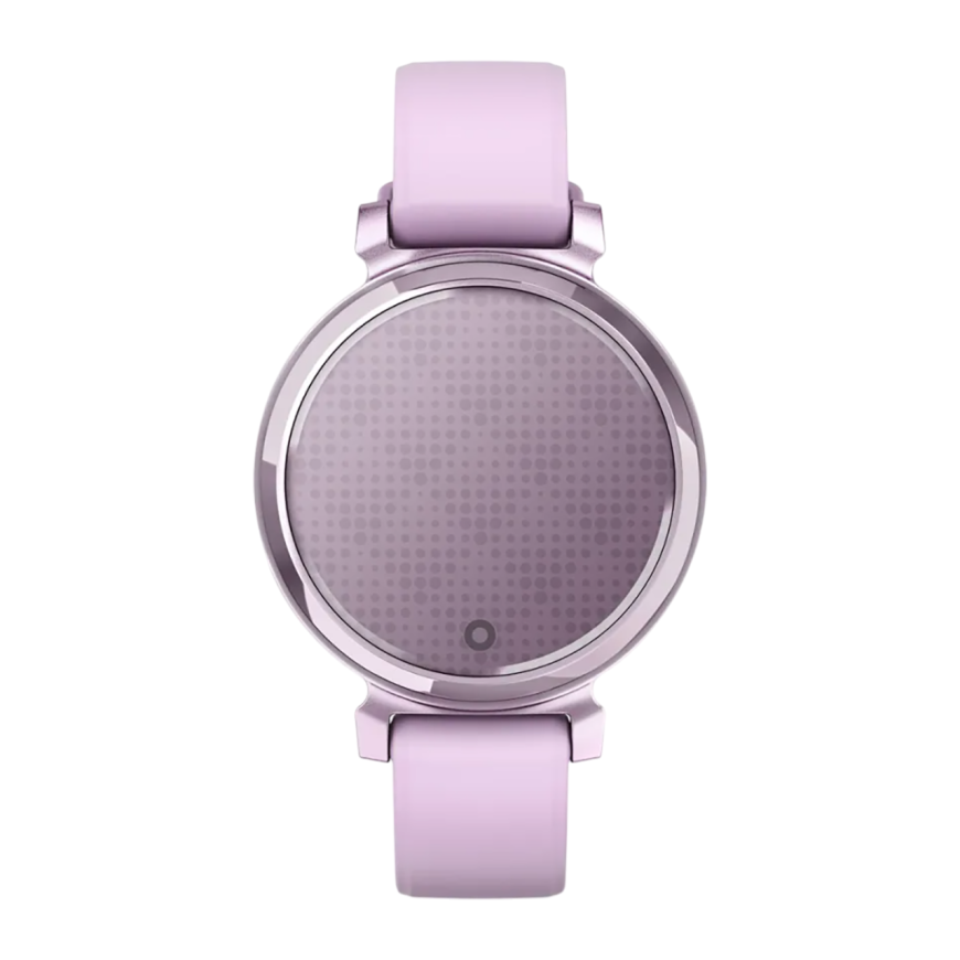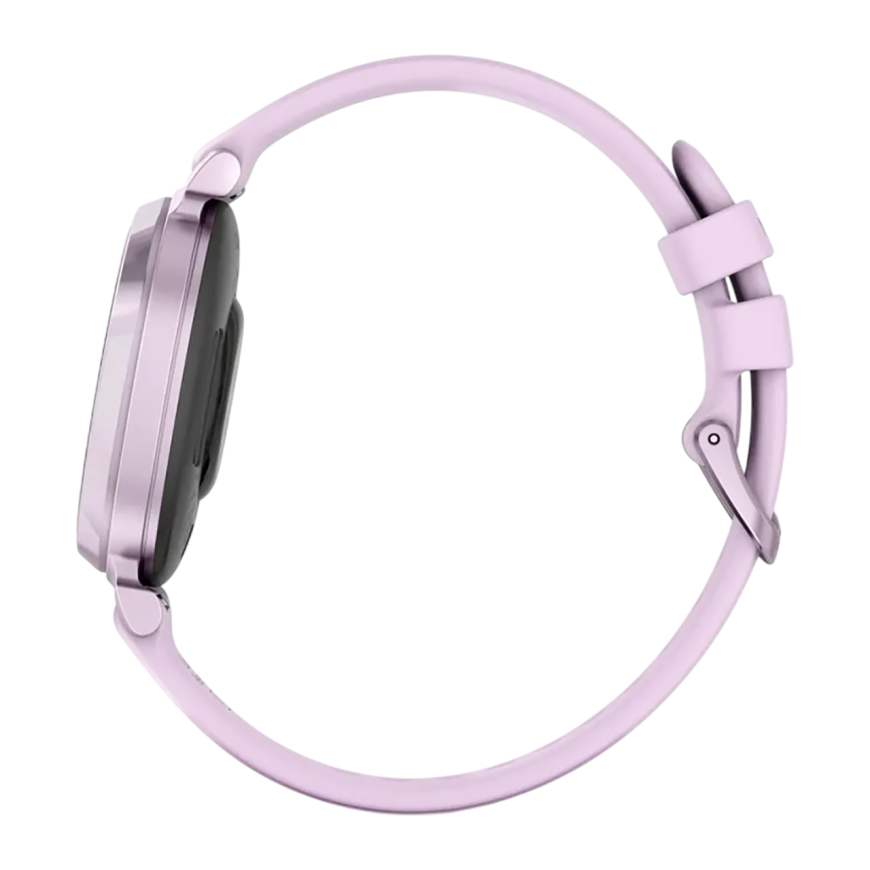 Спортивные часы Garmin Lily 2, сиреневый силиконовый ремешок Безель из алюминия цвета «сиреневый металлик», стекло Gorilla Glass. Ремешок с классической застёжкой — на запястье обхватом 110–175 мм