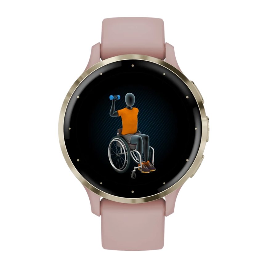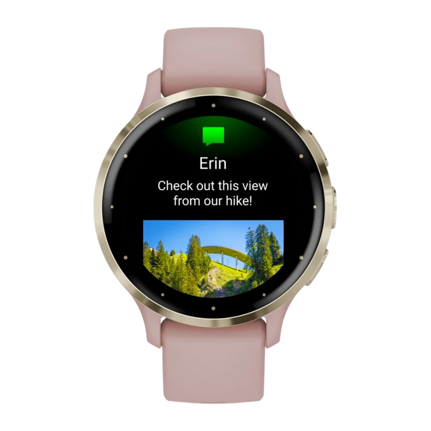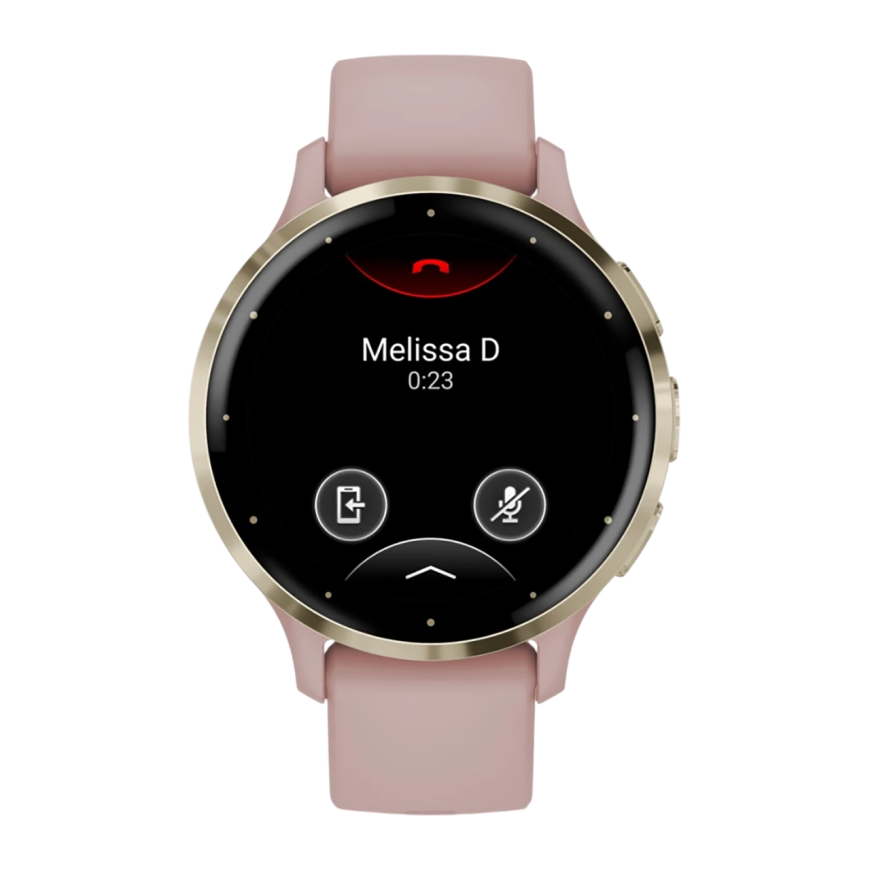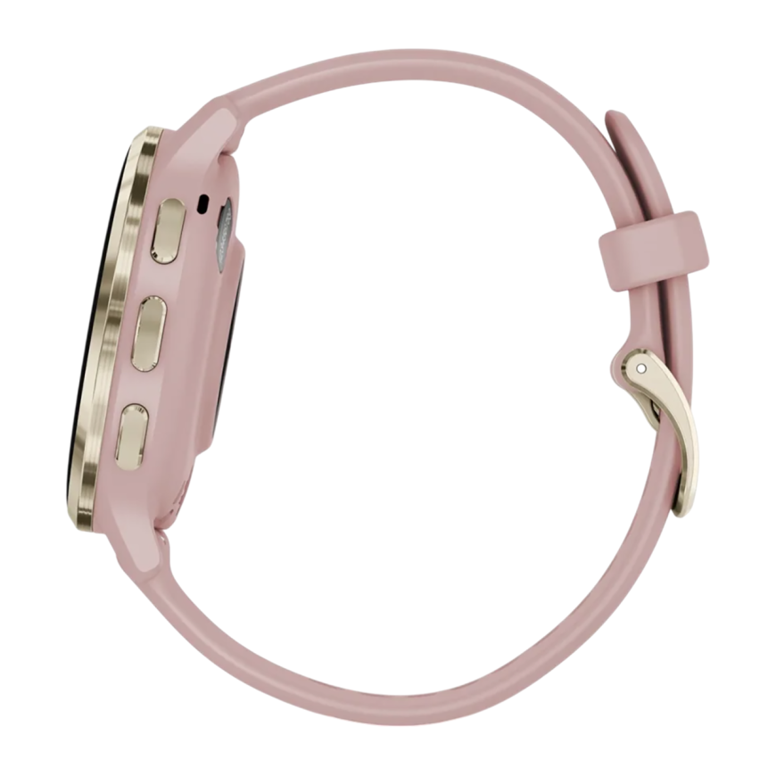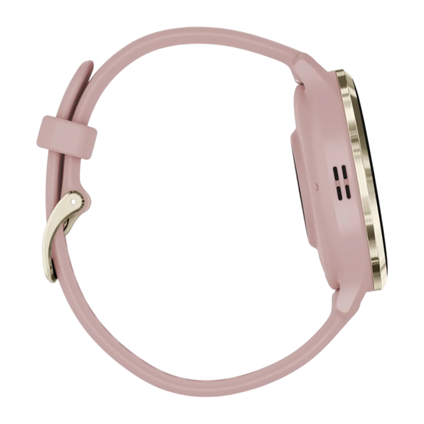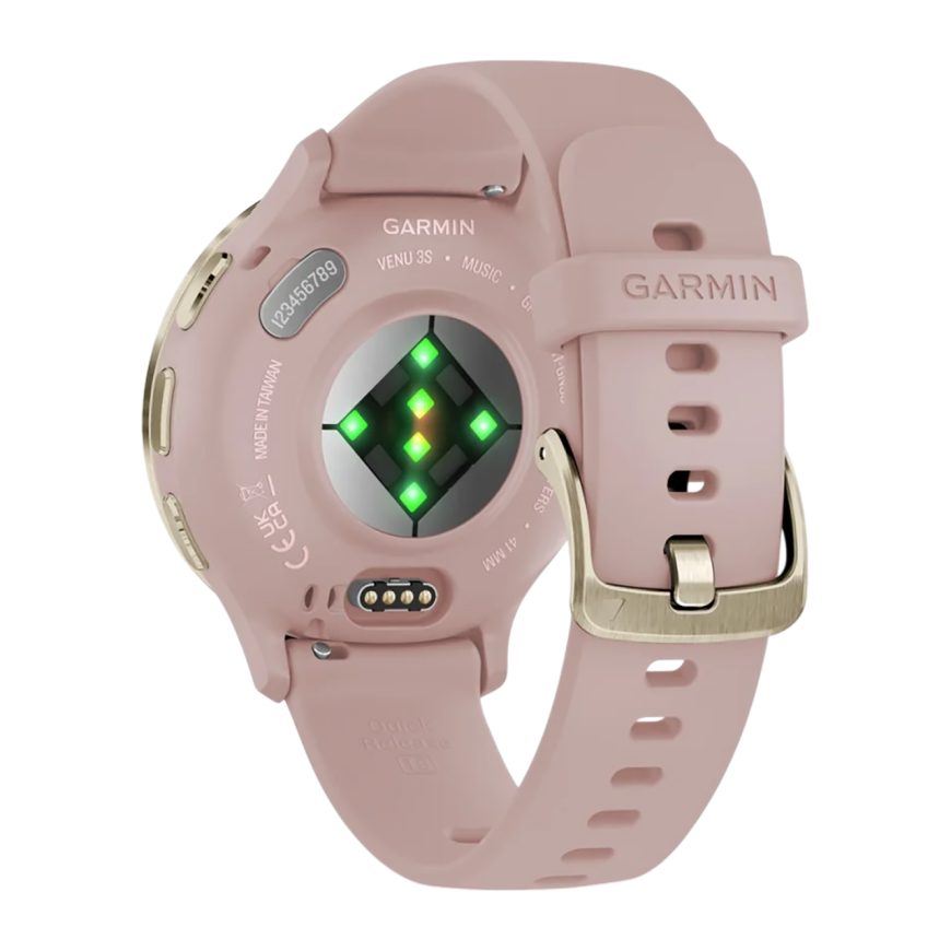 Спортивные часы Garmin Venu 3S, 41 мм, силиконовый ремешок цвета «пыльная роза» Безель из нержавеющей стали золотистого цвета, корпус цвета «пыльная роза», AMOLED-дисплей со стеклом Gorilla Glass. Ремешок с классической застёжкой — на запястье обхватом 11