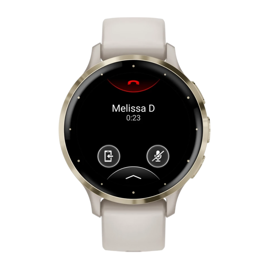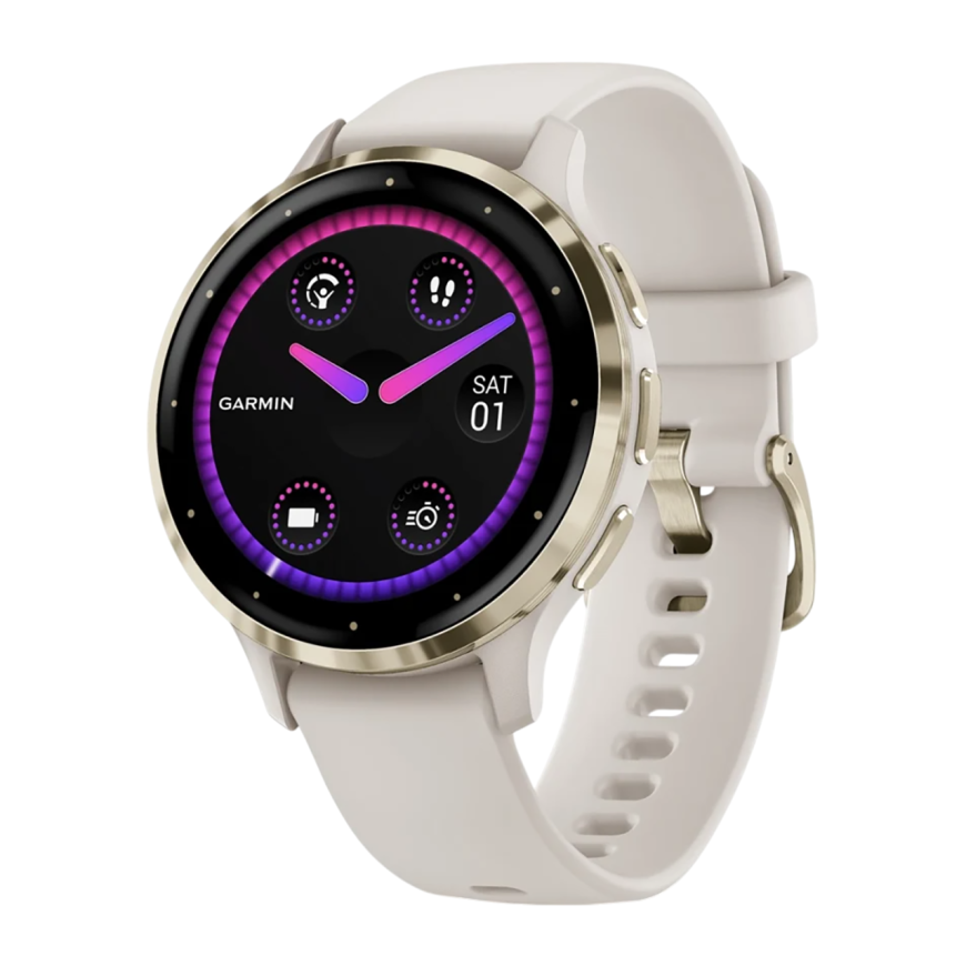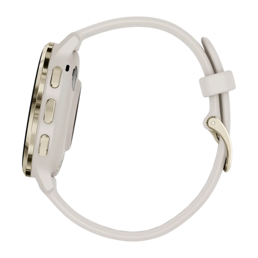 Спортивные часы Garmin Venu 3S, 41 мм, силиконовый ремешок цвета «слоновая кость» Безель из нержавеющей стали золотистого цвета, корпус цвета «слоновая кость», AMOLED-дисплей со стеклом Gorilla Glass. Ремешок с классической застёжкой — на запястье обхвато