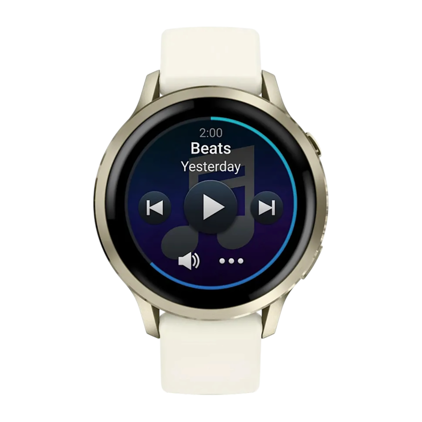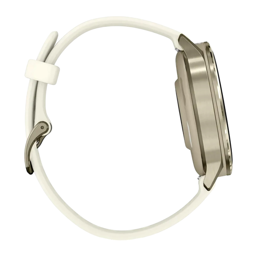 Спортивные часы Garmin Venu 4, 41 мм, силиконовый ремешок цвета кости Безель из нержавеющей стали цвета «лунное золото», корпус цвета «лунное золото», AMOLED-дисплей со стеклом Gorilla Glass. Ремешок с классической застёжкой — на запястье обхватом 110–175