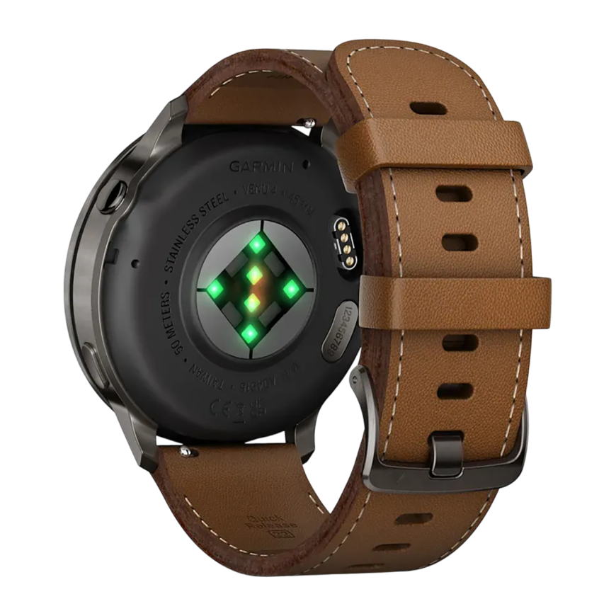 Garmin Venu 4 (45 мм) оснащены великолепным AMOLED-дисплеем диагональю 1,4 дюйма с разрешением 454x454 пикселя. Экран выдаёт сочную и чёткую картинку. Яркости дисплея достаточно для того, чтобы оставаться читаемым при ярком солнечном свете, что критически важно во время тренировок на открытом воздухе. Безель и корпус часов изготовлены из качественной стали, которая не только придаёт девайсу прочности, но и добавляет стиля. Экран часов прикрыт закалённым стеклом Corning Gorilla Glass 3. При этом Garmin Venu 4 не кричат всем своим видом, что они ориентированы на спорт. Элегантный дизайн часов позволяет носить их не только в спортзал, но и в офис или на деловую встречу.