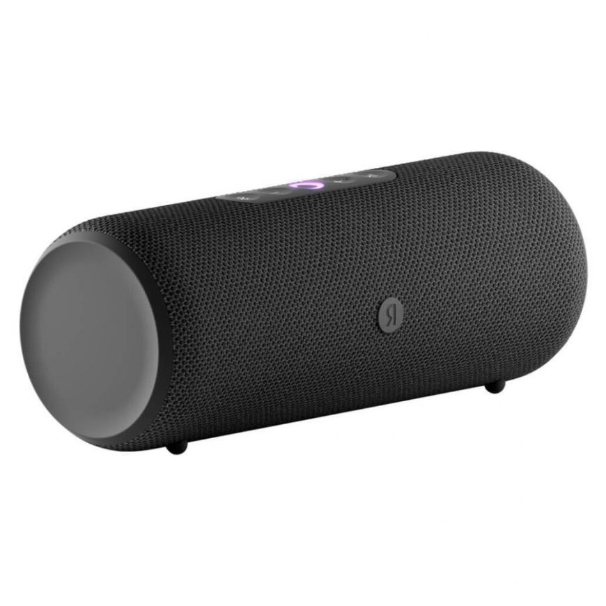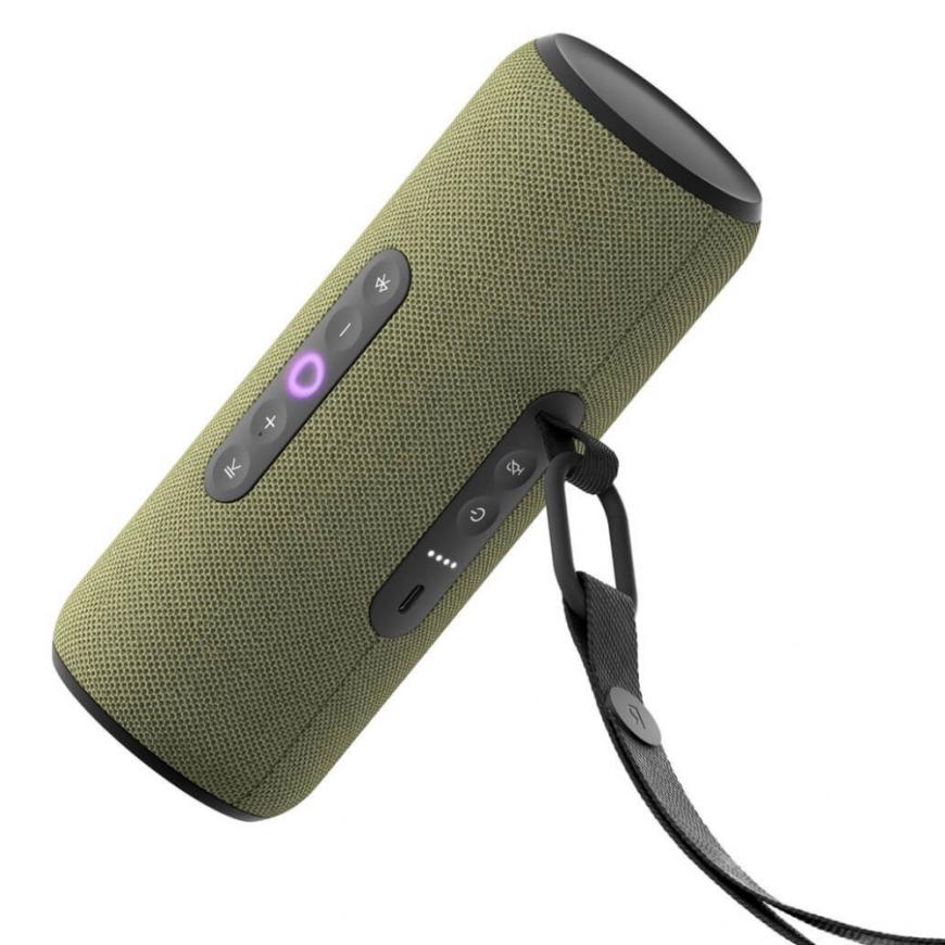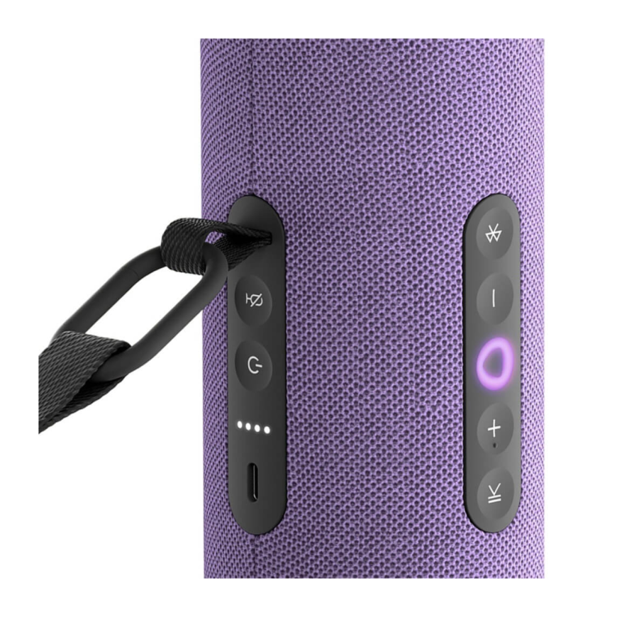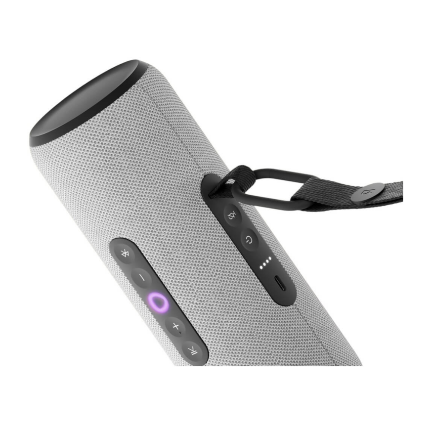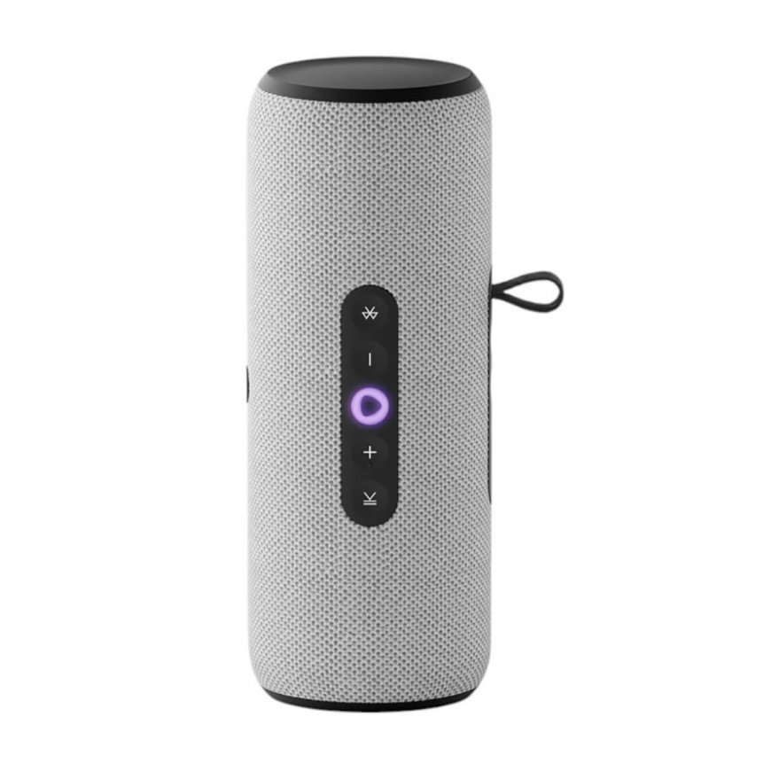 Колонка защищена от пыли и воды и соответствует классу IP67. Корпус у колонки довольно компактный, его длина составляет 20 см, а диаметр – 8. Вес портативной станции составляет 700 граммов. Приятная тканевая отделка дополняет элементы из матового пластика. С помощью специальной петли можно прикрепить комплектный кистевой ремешок с карабином, а можно и любой другой.