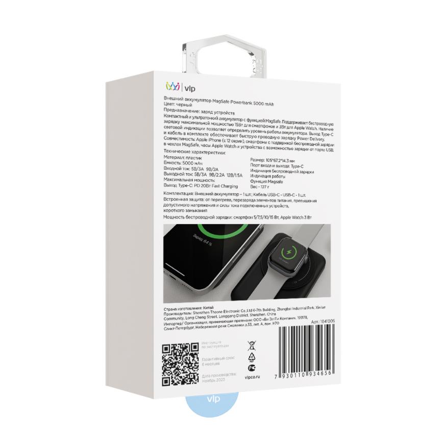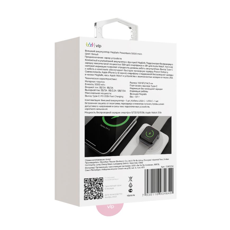 Корпус аккумулятора сделан из качественного пластика с Soft-touch покрытием, а его размеры исключают дискомфорт при использовании iPhone во время зарядки от такого "рюкзачка". VLP Dual Power Bank оснащён светодиодным индикатором, а мощные магниты надёжно удерживают его на устройстве или совместимом чехле. В центре массива MagSafe расположена магнитная зарядка для Apple Watch, поэтому отправляясь в поездку, можно не брать комплектный кабель для часов.