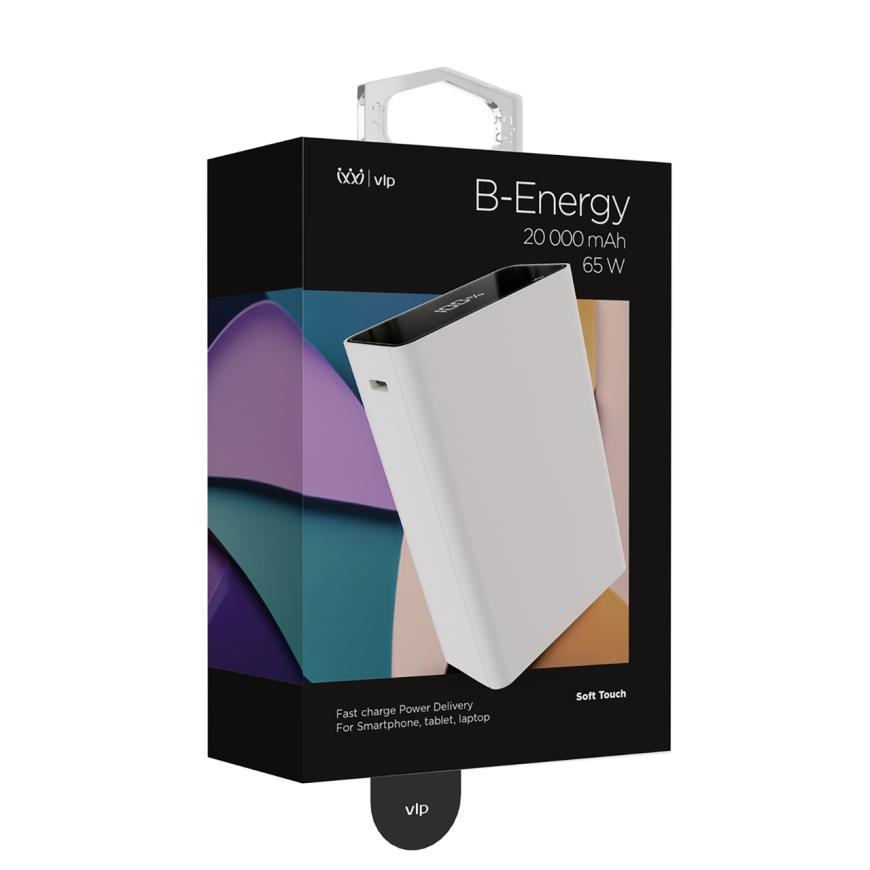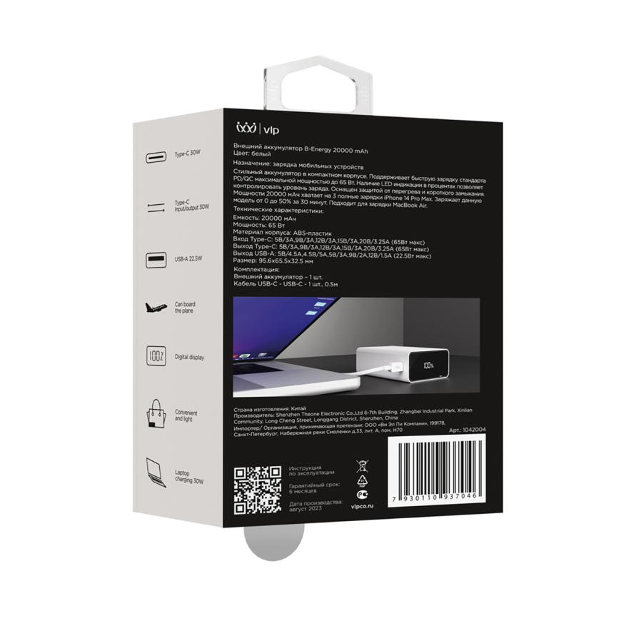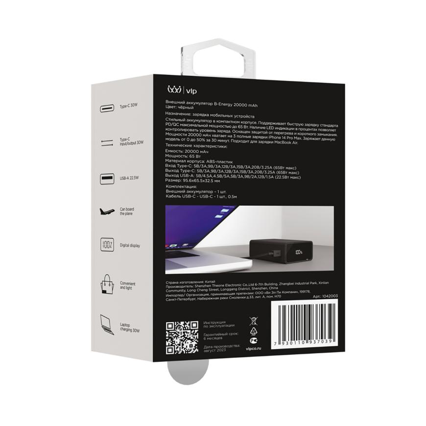 Этот компактный и мощный внешний аккумулятор от VLP серии B-Energy с внушительной ёмкостью в 20 000 мА/ч отличается не менее впечатляющей выходной мощностью в 65 Ватт и способностью быстро заряжать устройства. Помимо этого, он примечателен и своей надёжностью и обеспечивает все необходимые меры электрозащиты, а в комплект поставки уже входит качественный кабель USB-C небольшой длины, удобный для ношения с собой.