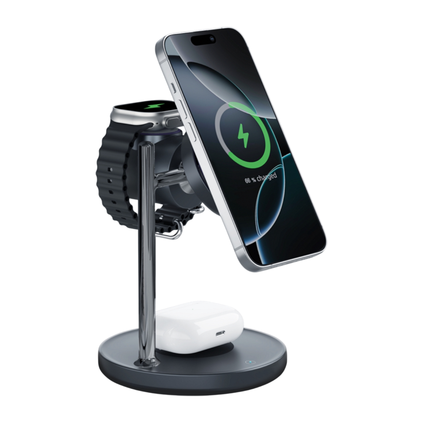 Главная задача для такой станции – чтобы она не просто питала, а упрощала жизнь. База требует всего одну розетку, убирая со стола два-три лишних кабеля и блока. Это мгновенно делает рабочий стол идеально чистым и минималистичным. Благодаря этому, все ваши гаджеты всегда заряжены до 100%, и вам больше не нужно возиться с разъемами. Пришли – поставили. Ушли – забрали полностью заряженные девайсы.