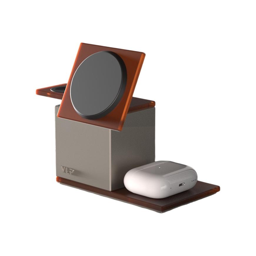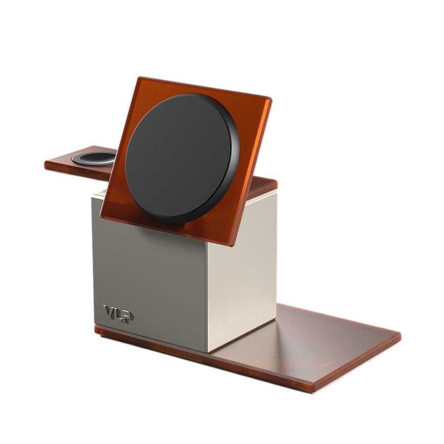 Итак, что тут есть. Верхняя площадка VLP x ALS NEO оснащена магнитным модулем с поддержкой MagSafe и стандарта Qi 2.2, который обеспечивает мощность до целых 25 Вт. Так что никаких долгих ожиданий – как iPhone, так и другие совместимые смартфоны будут быстро пополнять свои запасы. Кстати, сама платформа наклоняется и фиксируется под нужным углом, так что станция готова стать ещё и удобной подставкой. Рядом предусмотрено зарядное место для Apple Watch с мощностью 5 Вт, а также зона для беспроводной подпитки AirPods на 3 Вт.