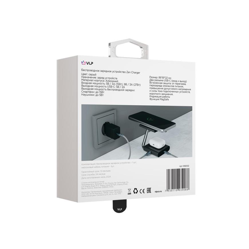В отличии от обычной беспроводной зарядки, VLP Zen Charger является многофункциональным устройством и может подзаряжать одновременно сразу три гаджета. Верхняя часть предназначена для смартфона и поддерживает мощность до 15 Вт. Ну а чтоб смартфон оттуда не упал, присутствуют магниты MagSafe, удерживающие его на платформе. Нижняя часть также имеет внутри катушку и может пополнить аккумулятор наушникам, с мощностью до 5 Вт. Ну а если требуется зарядить девайс не имеющего беспроводной зарядки, всегда есть порт USB-C.