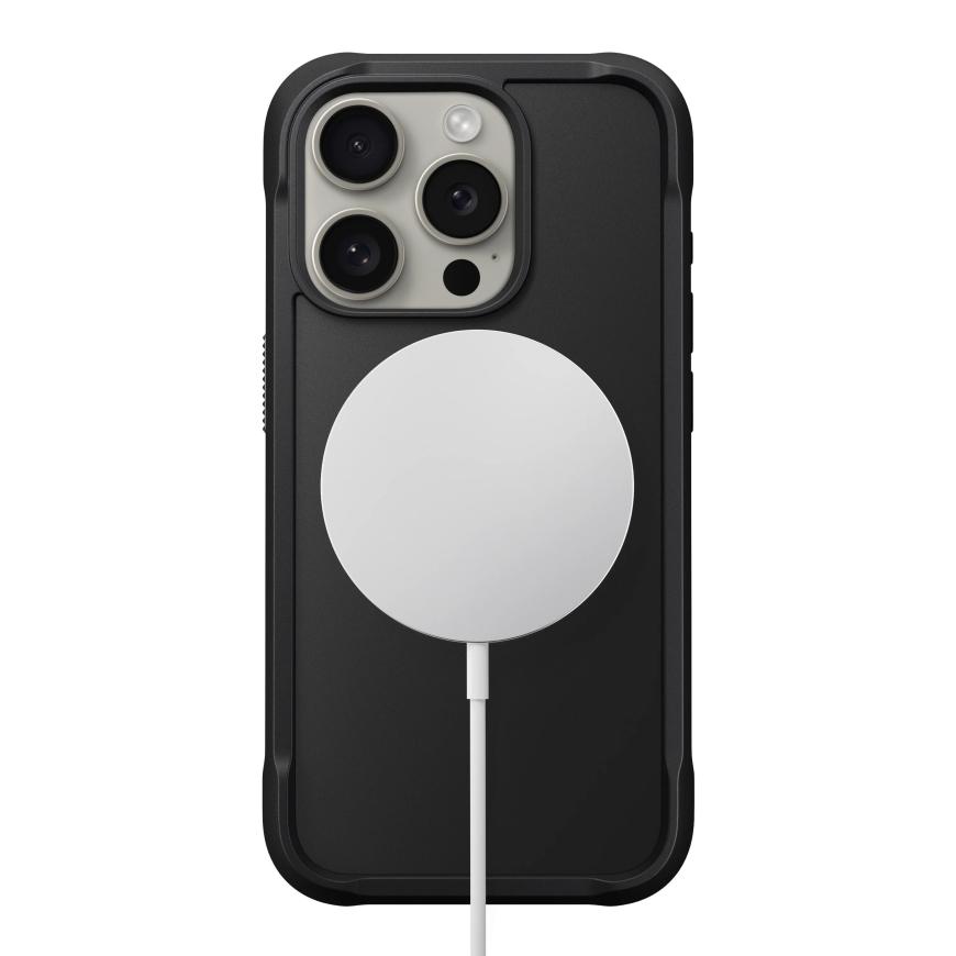 Несмотря на визуальную массивность, Nomad Rugged Case почти не утяжеляет смартфон. Кроме того, он не мешает беспроводной зарядке и использованию любых аксессуаров MagSafe, а кнопки нажимаются легко и приятно за счёт накладок из анодированного алюминия.